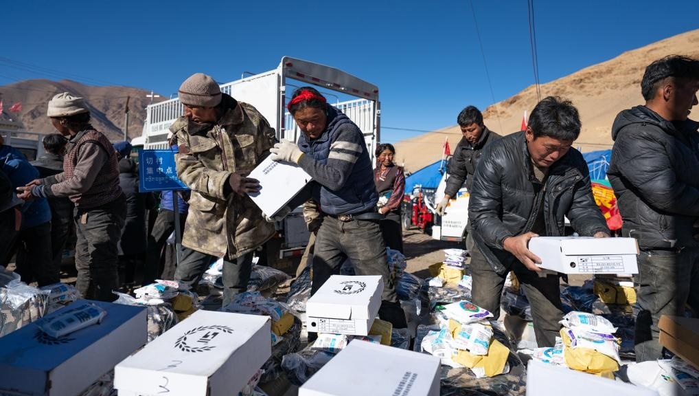 1月10日,在定結(jié)縣郭加鄉(xiāng)切村安置點,群眾分配救災物資。(新華社記者 丁增尼達 攝)