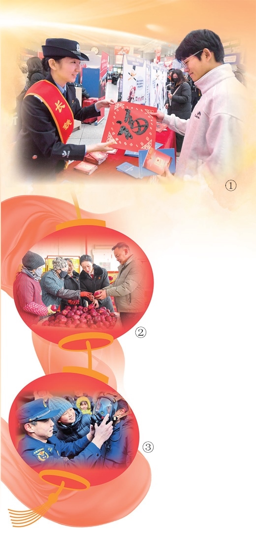 圖①:在吉林長(zhǎng)春,鐵路公安民警為旅客送“?!弊帧?/p>