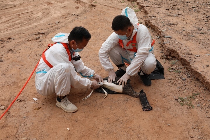 在甘肅張掖黑河濕地國家級(jí)自然保護(hù)區(qū),單國鋒(左)和同事為一只黑鸛戴上監(jiān)測設(shè)備(資料照片)。新華社發(fā)(甘肅張掖黑河濕地國家級(jí)自然保護(hù)區(qū)管理局供圖)