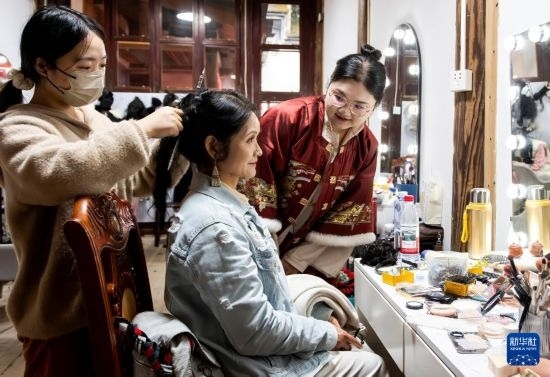 2月3日,在福州三坊七巷一處“三條簪”化妝跟拍點(diǎn),化妝師在為來自上海的母女進(jìn)行“三條簪”妝造。