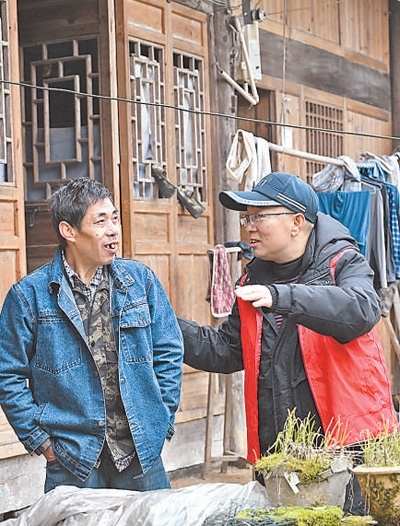 在湖南省湘西土家族苗族自治州花垣縣邊城鎮(zhèn)通州村,駐村工作隊(duì)隊(duì)員(右)與村民交流。