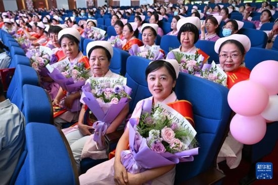 5月9日在內蒙古自治區(qū)婦幼保健院學術報告廳拍攝的接受表彰的護士們。