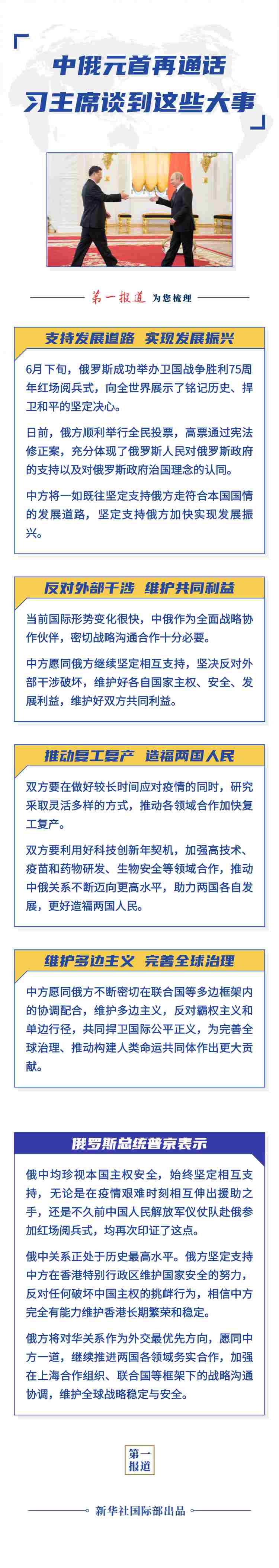 習(xí)近平強(qiáng)調(diào),中俄在新冠肺炎疫情最艱難的時(shí)刻相互支持、相互幫助,為新時(shí)代中俄關(guān)系增添了戰(zhàn)略內(nèi)涵。雙方要在做好較長時(shí)間應(yīng)對(duì)疫情的同時(shí),研究采取靈活多樣的方式,推動(dòng)各領(lǐng)域合作加快復(fù)工復(fù)產(chǎn)。雙方要利用好科技創(chuàng)新年契機(jī),加強(qiáng)高技術(shù)、疫苗和藥物研發(fā)、生物安全等領(lǐng)域合作,推動(dòng)中俄關(guān)系不斷邁向更高水平,助力兩國各自發(fā)展,更好造福兩國人民。中方愿同俄方不斷密切在聯(lián)合國等多邊框架內(nèi)的協(xié)調(diào)配合,維護(hù)多邊主義,反對(duì)霸權(quán)主義和單邊行徑,共同捍衛(wèi)國際公平正義,為完善全球治理、推動(dòng)構(gòu)建人類命運(yùn)共同體作出更大貢獻(xiàn)。