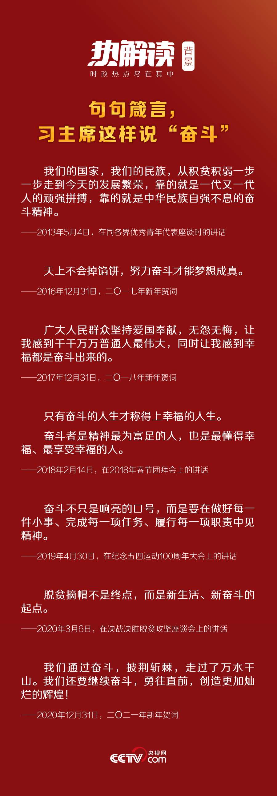 2020年,“十三五”圓滿收官,“十四五”全面擘畫;2021年,既是“十四五”開局之年,又是“兩個(gè)一百年”的歷史交匯點(diǎn),全面建設(shè)社會(huì)主義現(xiàn)代化國家新征程即將開啟。在這個(gè)關(guān)鍵節(jié)點(diǎn)再次強(qiáng)調(diào)“奮斗”,習(xí)近平主席意蘊(yùn)深遠(yuǎn)。