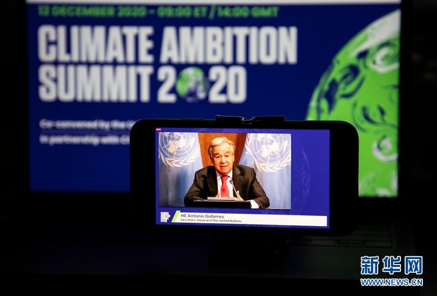 這是2020年12月12日在美國紐約拍攝的聯(lián)合國秘書長古特雷斯在氣候雄心峰會上通過視頻發(fā)表講話的屏幕畫面。氣候雄心峰會由聯(lián)合國及有關(guān)國家倡議舉辦,旨在紀(jì)念《巴黎協(xié)定》達(dá)成五周年,進(jìn)一步動員國際社會強化氣候行動,推進(jìn)多邊進(jìn)程。新華社記者