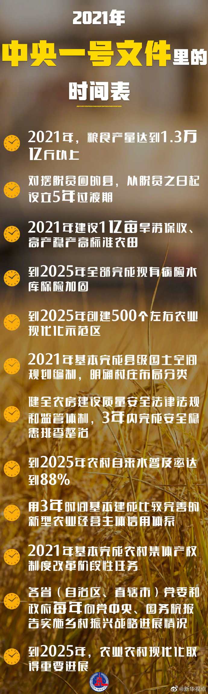 2021年糧食產(chǎn)量達(dá)到1.3萬億斤以上、2021年建設(shè)1億畝高標(biāo)準(zhǔn)農(nóng)田、到2025年農(nóng)村自來水普及率達(dá)到88%……今年中央一號文件仍聚焦“三農(nóng)”,對多方面工作作出詳細(xì)部署,明確了時(shí)間表。一起了解下↓