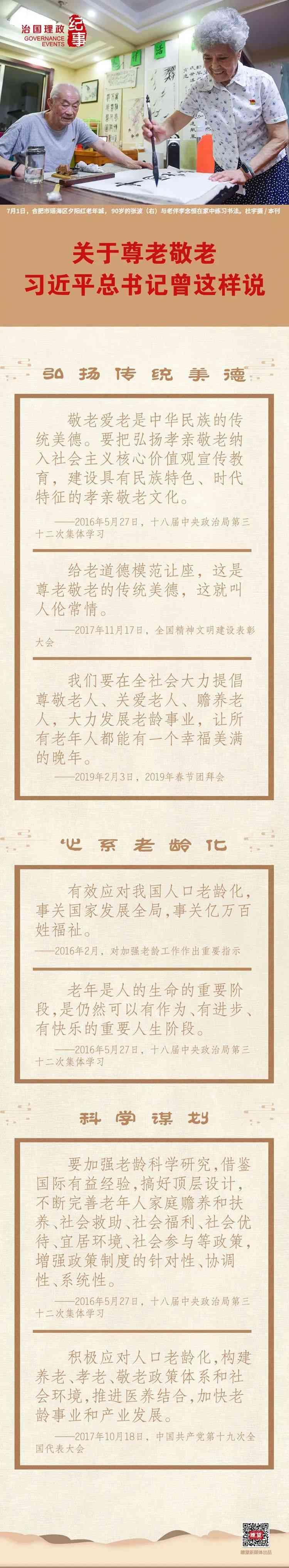 “古人講,‘夫孝,德之本也’。自古以來,中國(guó)人就提倡孝老愛親,倡導(dǎo)老吾老以及人之老、幼吾幼以及人之幼。我國(guó)已經(jīng)進(jìn)入老齡化社會(huì)。讓老年人老有所養(yǎng)、老有所依、老有所樂、老有所安,關(guān)系社會(huì)和諧穩(wěn)定?!?019年春節(jié)團(tuán)拜會(huì)上,習(xí)近平總書記這樣講述他心中的“孝”與尊老敬老傳統(tǒng)美德。