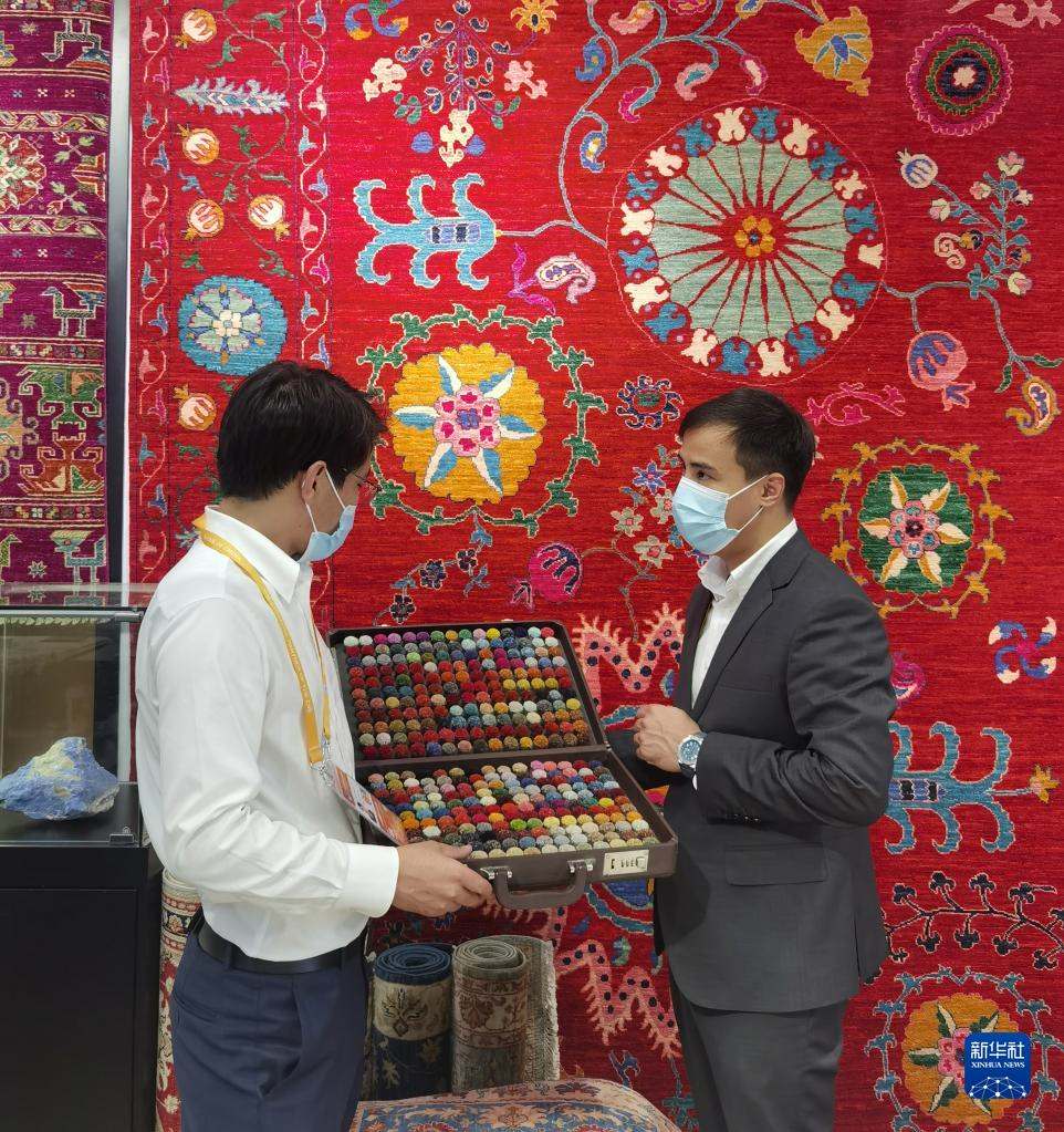 11月5日,阿富汗參展商阿里·法伊茲(右)在第四屆進(jìn)博會阿富汗手工羊毛地毯展臺忙碌。新華社記者吳宇攝