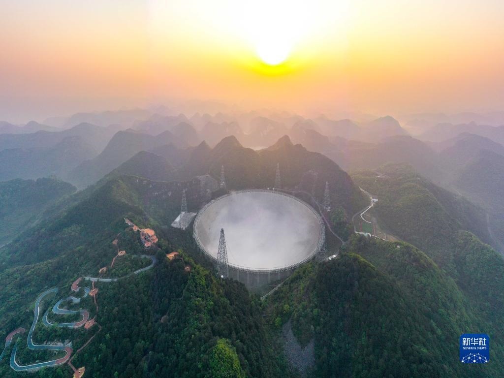 3月31日清晨拍攝的“中國天眼”全景(維護(hù)保養(yǎng)期間拍攝,無人機(jī)照片)。新華社記者歐東衢攝