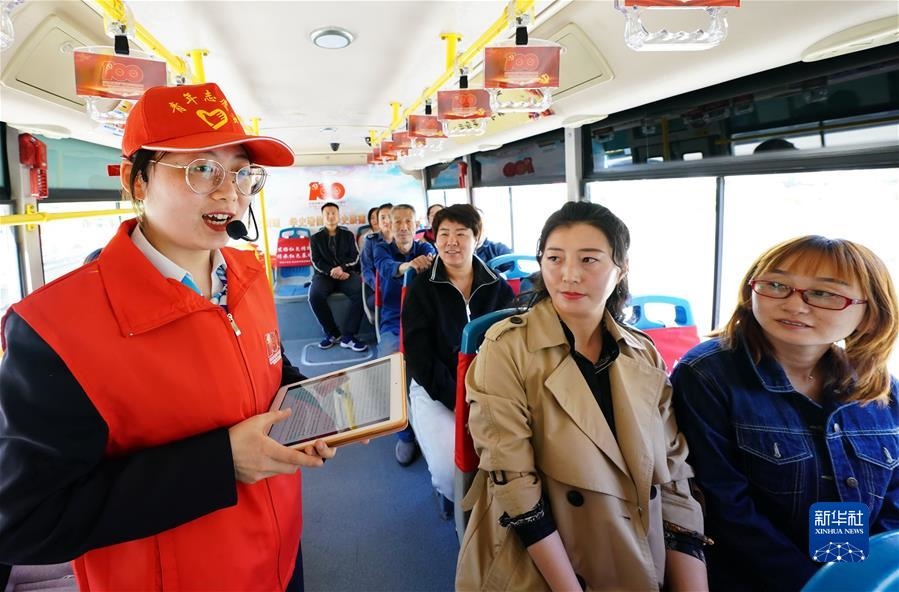 河北省唐山市海港經(jīng)濟(jì)開(kāi)發(fā)區(qū)志愿者宣講員在紅色主題公交車(chē)上給乘客講革命故事(5月10日攝)。新華社記者楊世堯攝