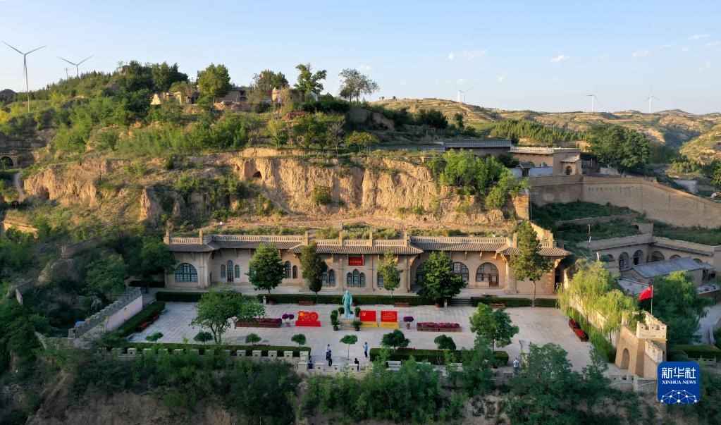 游人在陜西省榆林市米脂縣楊家溝革命舊址參觀(2021年9月10日攝,無(wú)人機(jī)照片)。新華社記者陶明攝