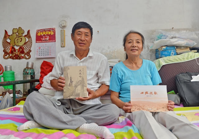△楊玉芳(左)、高志宏(右)夫婦在家中展示他們所寫(xiě)的書(shū)。