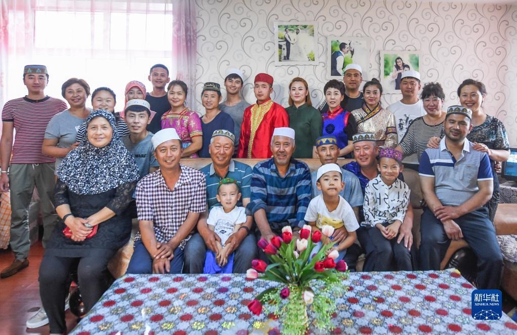 這是家住內(nèi)蒙古呼倫貝爾的夏民山(前排右三)家的家庭合影。他家由回族、漢族、蒙古族、達(dá)斡爾族、鄂溫克族、滿(mǎn)族共6個(gè)民族組成,45口人,三代同堂(2017年7月16日攝)。新華社記者 連振 攝