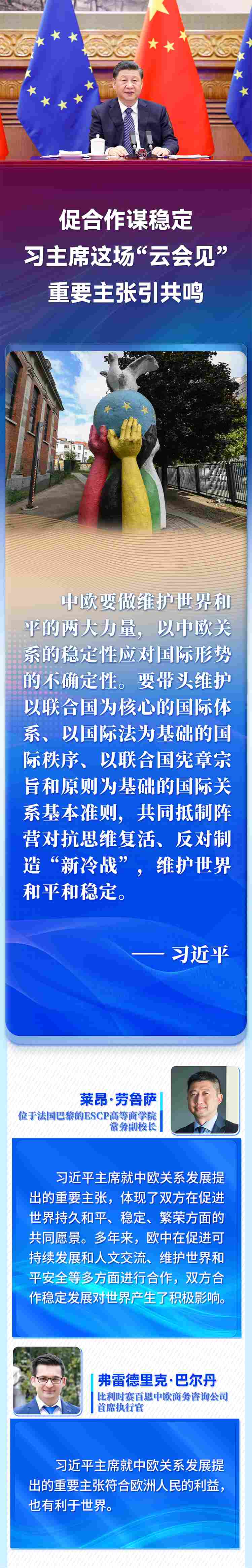 國家主席習近平4月1日晚在北京以視頻方式會見歐洲理事會主席米歇爾和歐盟委員會主席馮德萊恩。歐洲多國人士高度評價習近平主席就中歐關系、烏克蘭危機等問題提出的重要主張,認為會晤為雙方關系持續(xù)健康發(fā)展作出戰(zhàn)略引領,為復雜動蕩的國際局勢注入穩(wěn)定性。