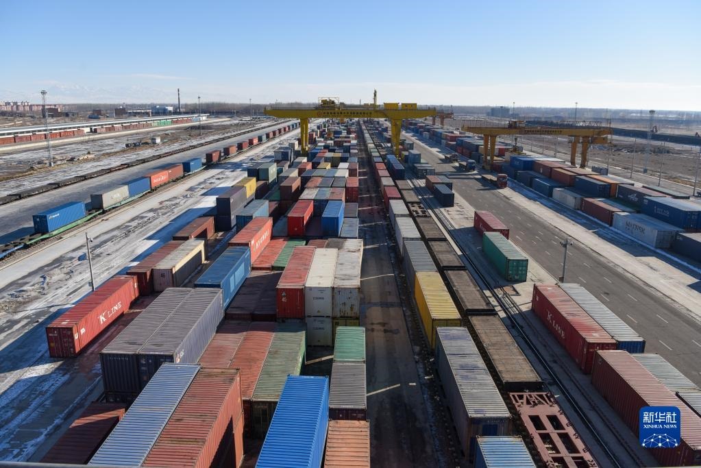 在新疆霍爾果斯鐵路口岸,換裝場內(nèi)在進(jìn)行班列換裝作業(yè)(2021年2月6日攝)。新華社記者 丁磊 攝