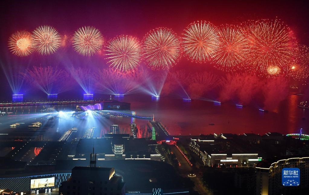 這是2018年6月9日晚在青島舉行的《有朋自遠(yuǎn)方來》燈光焰火藝術(shù)表演。2018年6月9日至10日,上海合作組織成員國元首理事會第十八次會議在青島召開。新華社記者 李紫恒 攝
