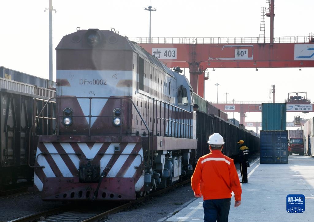 一列搭載輪胎、汽車配件、電子元件等貨物的“齊魯號”中亞班列即將發(fā)車駛出位于青島的中國-上合組織地方經(jīng)貿(mào)合作示范區(qū)青島多式聯(lián)運中心(2020年11月9日攝)。新華社記者 李紫恒 攝