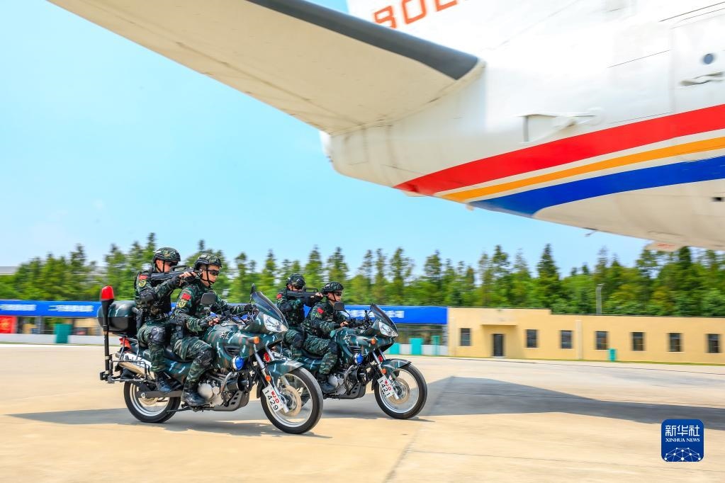 武警上??傟?duì)機(jī)動(dòng)第一支隊(duì)特戰(zhàn)某中隊(duì)組織交通工具反劫持綜合演練,特戰(zhàn)隊(duì)員乘坐摩托車接近“被劫持飛機(jī)”(2022年8月1日攝)。新華社發(fā)(李巖攝)