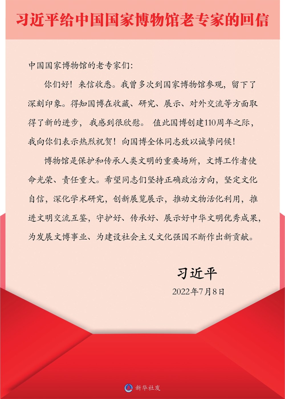 7月8日,中共中央總書記、國家主席、中央軍委主席習近平給中國國家博物館的老專家回信,在國博創(chuàng)建110周年之際,向國博全體同志致以熱烈祝賀和誠摯問候。