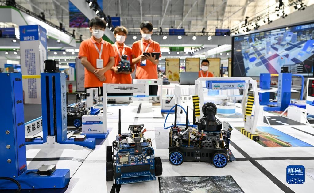 在天津舉行的世界職業(yè)技術教育發(fā)展大會首屆世界職業(yè)院校技能大賽上,參賽選手在實訓沙盤前操作機器人設備(2022年8月20日攝)。新華社記者 孫凡越 攝