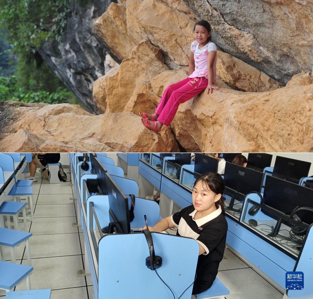 這是一張拼版照片,上圖為:在廣西大化瑤族自治縣板升鄉(xiāng)弄雷村哈保屯,11歲的蒙秋艷在懸崖邊休息,這一處約300米長的半山懸崖,是她讀小學期間每天都要走的路(2012年9月5日新華社記者黃孝邦攝);下圖為:已經實現大學夢想的蒙秋艷,就讀于廣西醫(yī)科大學,這是她在學校的語音室學習(新華社發(fā),2022年9月5日韋婷婷攝)。新華社發(fā)