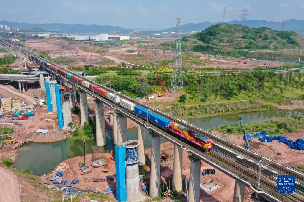 中緬新通道(重慶—臨滄—緬甸)國(guó)際鐵路班列從重慶果園港魚(yú)嘴車站順利發(fā)車(5月23日攝,無(wú)人機(jī)照片)。新華社記者 唐奕 攝