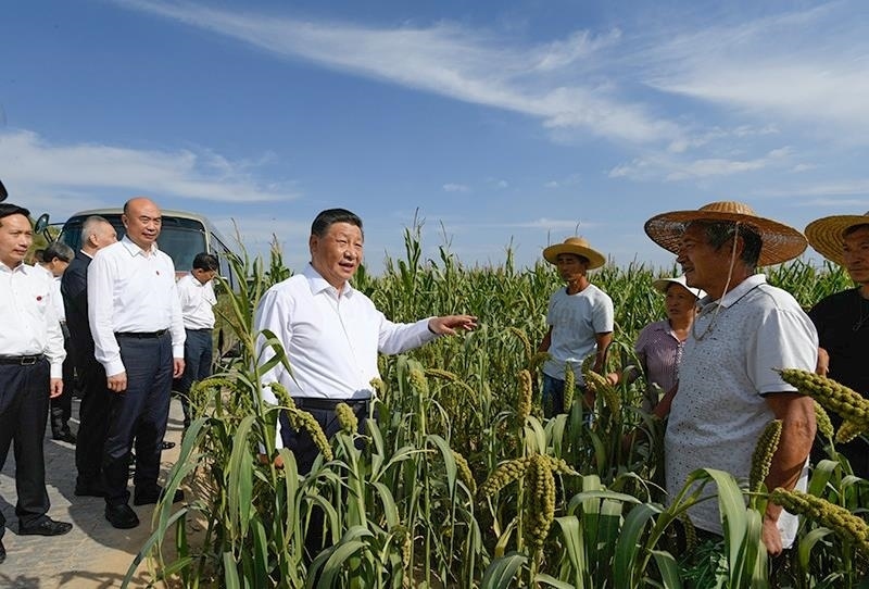 △2021年9月13日,習(xí)近平總書記在陜西米脂縣高西溝村臨時(shí)下車,察看糧食作物長(zhǎng)勢(shì),同正在田間勞作的老鄉(xiāng)拉家常。