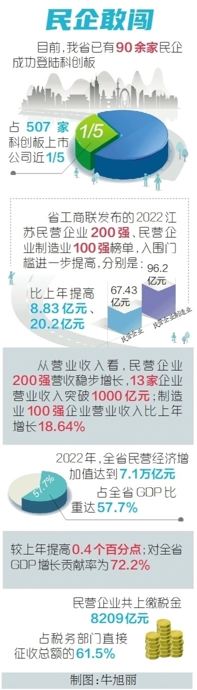 勇立實(shí)業(yè)潮頭,爭(zhēng)當(dāng)奮楫搏浪的“水手”,另一份榜單同樣能佐證江蘇民企的勇毅前行。去年9月,省工商聯(lián)發(fā)布2022江蘇民營(yíng)企業(yè)200強(qiáng)、民營(yíng)企業(yè)制造業(yè)100強(qiáng)榜單,入圍門(mén)檻進(jìn)一步提高,分別達(dá)67.43億元、96.2億元,比上年提高8.83億元、20.2億元。從營(yíng)業(yè)收入看,民營(yíng)企業(yè)200強(qiáng)營(yíng)收穩(wěn)步增長(zhǎng),13家企業(yè)營(yíng)業(yè)收入突破1000億元;制造業(yè)100強(qiáng)企業(yè)營(yíng)業(yè)收入比上年增長(zhǎng)18.64%。