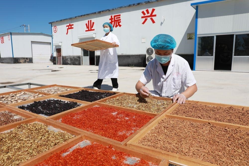 △山東濱州青田街道合作社社員在晾曬中草藥。