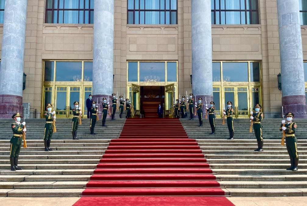 會(huì)談前,習(xí)近平在人民大會(huì)堂東門(mén)外廣場(chǎng)為伊薩亞斯舉行歡迎儀式。