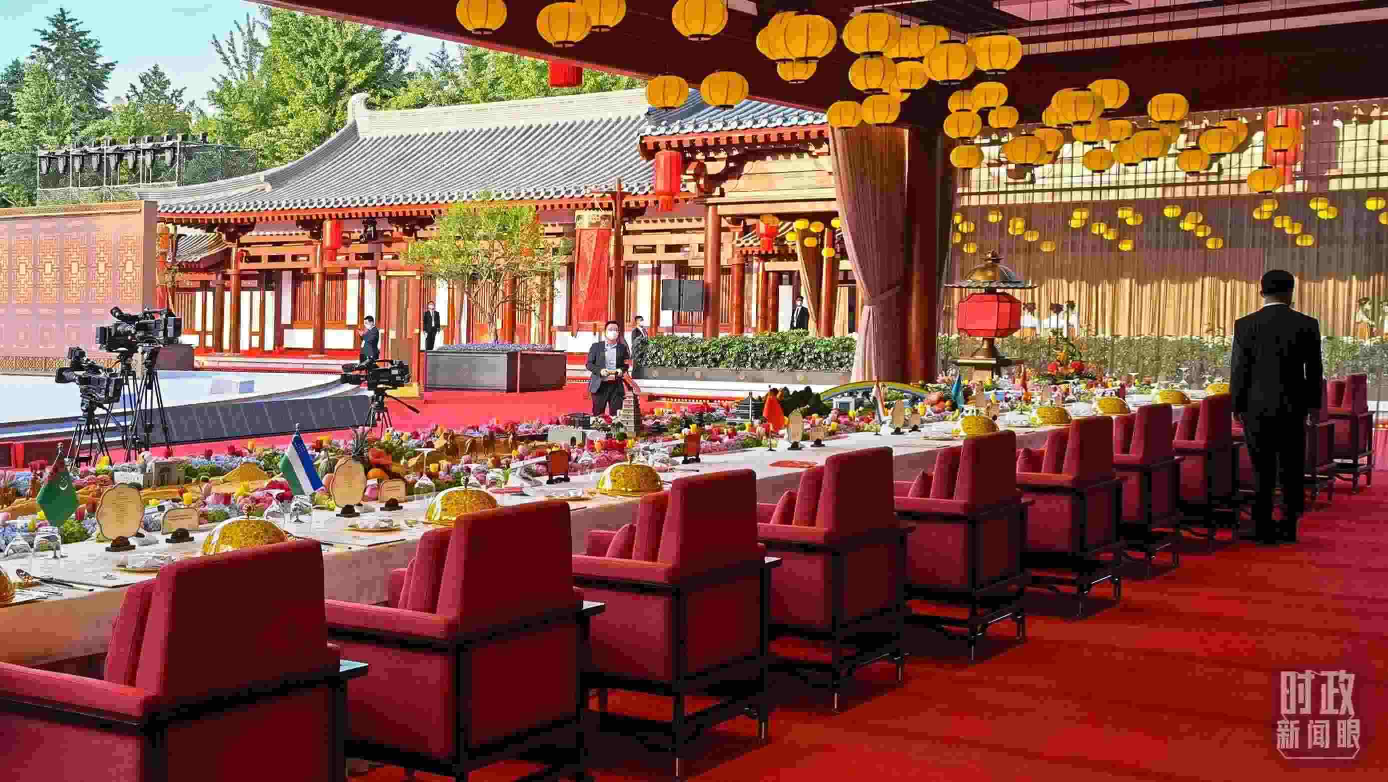 △歡迎晚宴的餐臺設(shè)計融入古絲綢之路和“一帶一路”元素,并穿插中國和中亞五國的標(biāo)志性建筑,獨具匠心。(總臺央視記者石丞拍攝)