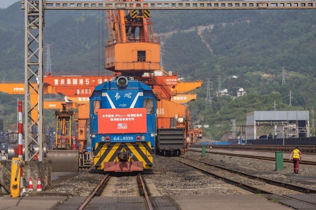這是2023年4月27日,太平船務(wù)——西部陸海新通道江鐵海聯(lián)運(yùn)非洲專列在重慶果園港魚嘴站等待發(fā)車。