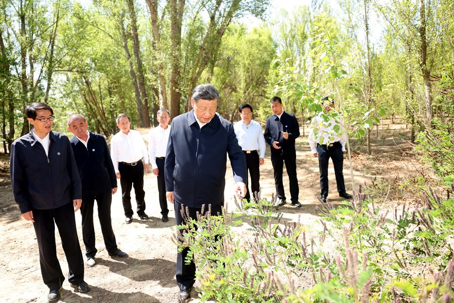 2023年6月5日至6日,中共中央總書記、國家主席、中央軍委主席習近平在內(nèi)蒙古巴彥淖爾考察,并主持召開加強荒漠化綜合防治和推進“三北”等重點生態(tài)工程建設(shè)座談會。這是6日上午,習近平在臨河區(qū)國營新華林場考察。新華社記者