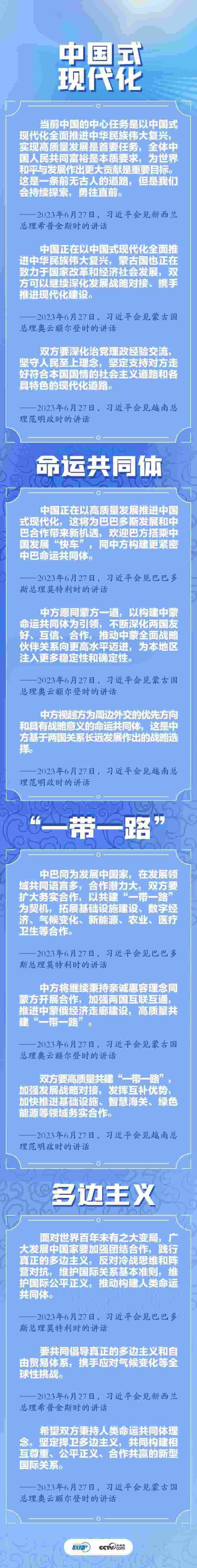 央視網(wǎng)《聯(lián)播+》梳理發(fā)現(xiàn),四場雙邊會見中,“中國式現(xiàn)代化”“命運共同體”“一帶一路”“多邊主義”四個關(guān)鍵詞頻繁出現(xiàn)。