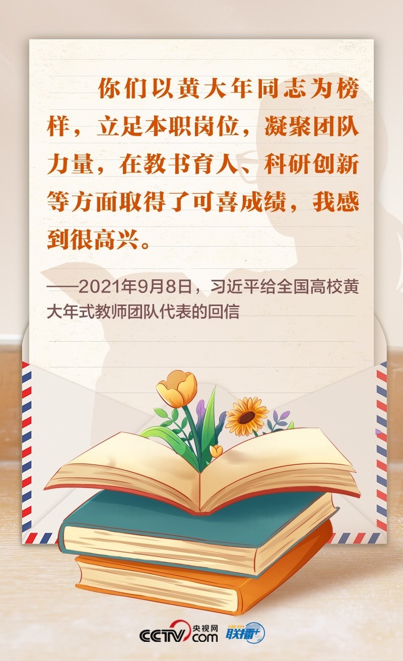 2021年,首批黃大年式教師團隊的代表給總書記寫信,匯報教學(xué)、科研等工作情況,表達了堅守教育報國理想、為民族復(fù)興貢獻力量的決心??倳浕匦趴隙舜蠹业墓ぷ鞒尚?,勉勵大家繼續(xù)學(xué)習(xí)弘揚黃大年同志等優(yōu)秀教師的高尚精神,立德修身,潛心治學(xué),開拓創(chuàng)新,真正把為學(xué)、為事、為人統(tǒng)一起來,當好學(xué)生成長的引路人。