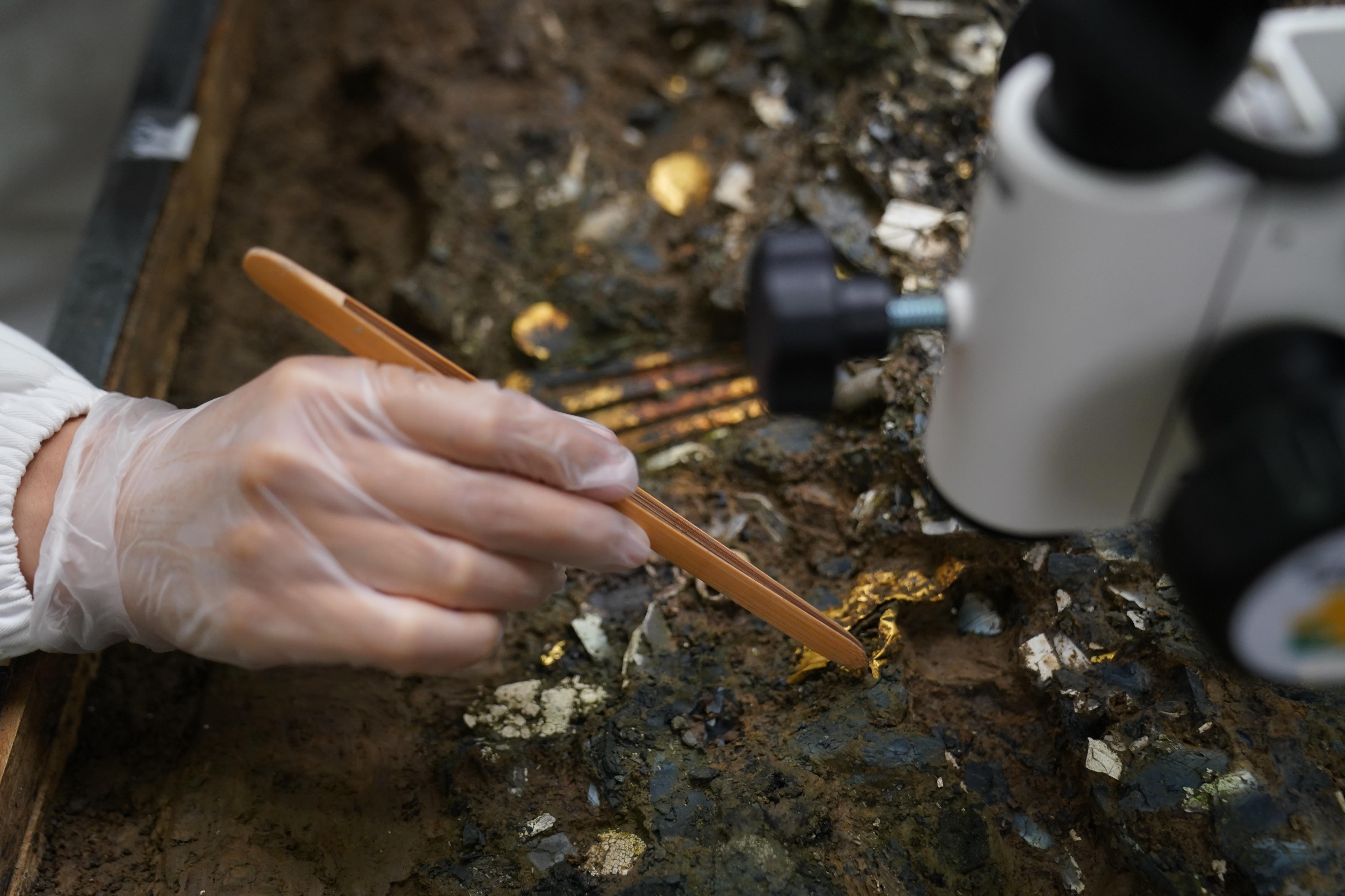 △三星堆博物館文物保護修復(fù)館內(nèi),三星堆文物修復(fù)人員正在對出土文物進行清理。(總臺國廣記者李晉拍攝)