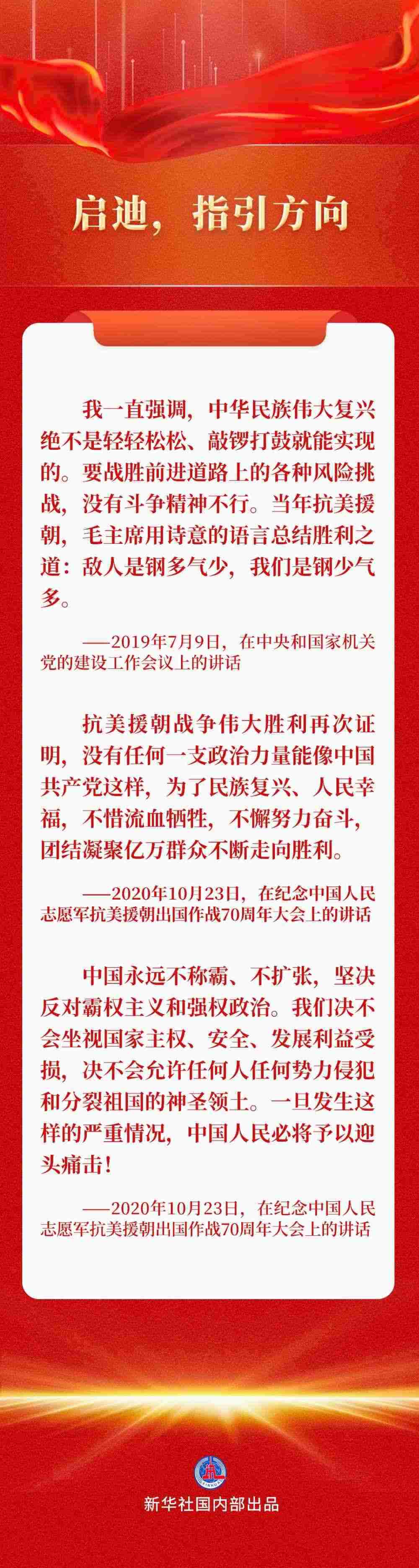 習(xí)近平總書(shū)記曾多次談起這段氣壯山河的英雄史詩(shī),深情講述這些“最可愛(ài)的人”的動(dòng)人故事,以史為鑒,為全黨全軍全國(guó)各族人民指明前行方向。