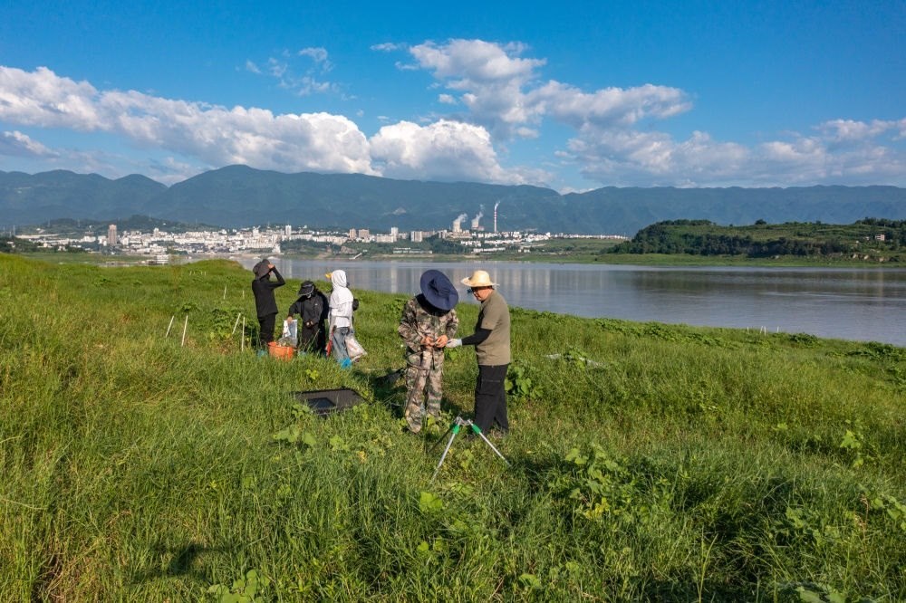 在位于重慶的中國科學(xué)院三峽庫區(qū)水土保持與環(huán)境研究站,中國科學(xué)院成都山地所科研人員在庫區(qū)消落帶上開展相關(guān)監(jiān)測(2023年7月5日攝,無人機照片)。新華社記者 黃偉 攝