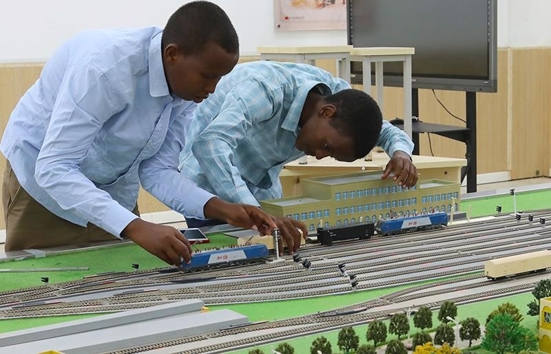 △2022年9月19日,在位于吉布提首都吉布提市的吉布提工商學(xué)校,學(xué)生在魯班工坊鐵道運(yùn)營沙盤教學(xué)區(qū)學(xué)習(xí)。