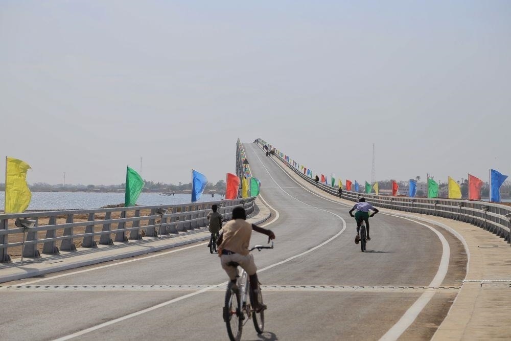 △2022年1月16日,人們騎車通過位于塞內(nèi)加爾方久尼市、由中國公司承建的方久尼大橋。