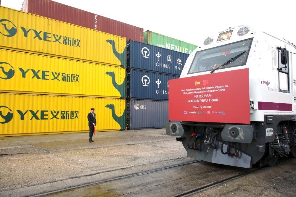 △2023年3月9日,以“中西建交紀(jì)念號(hào)”特別命名的“義新歐”中歐班列從馬德里鳴笛發(fā)車(chē),與從義烏同時(shí)開(kāi)出的列車(chē)雙向而行。