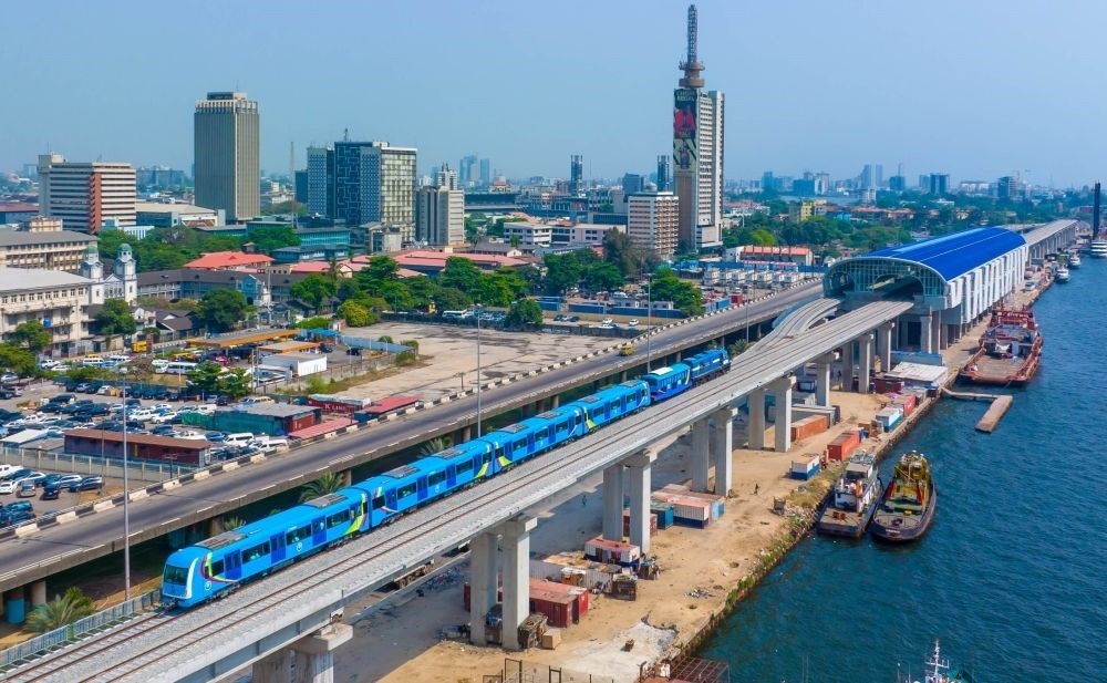 這是尼日利亞拉各斯輕軌藍(lán)線上的一列輕軌列車(2022年12月21日攝,無人機(jī)照片)。新華社發(fā)(托普·阿尤庫(kù)攝)