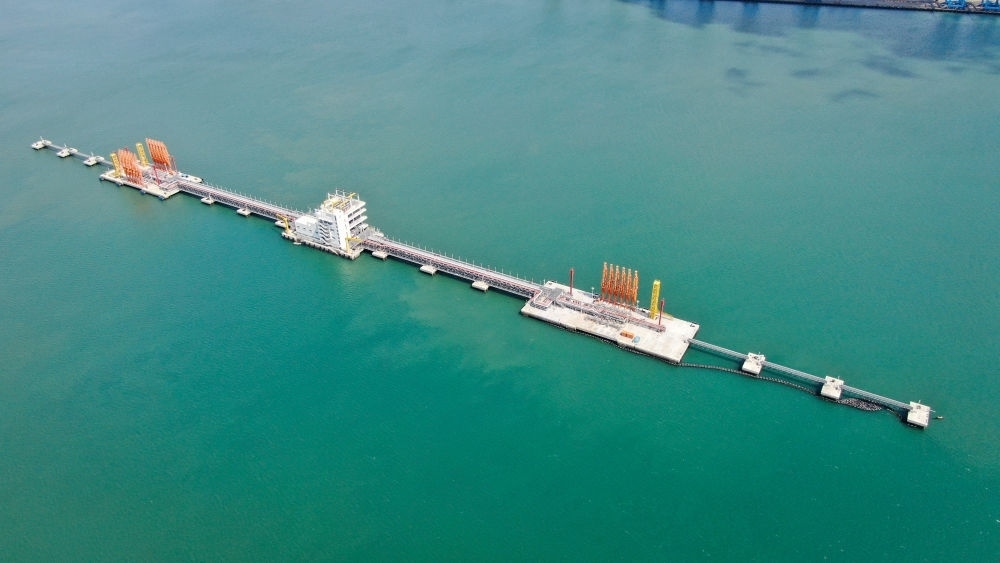 這是肯尼亞蒙巴薩油碼頭(2023年9月20日攝,無人機(jī)照片)。新華社發(fā)(中國(guó)交通建設(shè)股份有限公司肯尼亞蒙巴薩新建油碼頭項(xiàng)目部供圖)