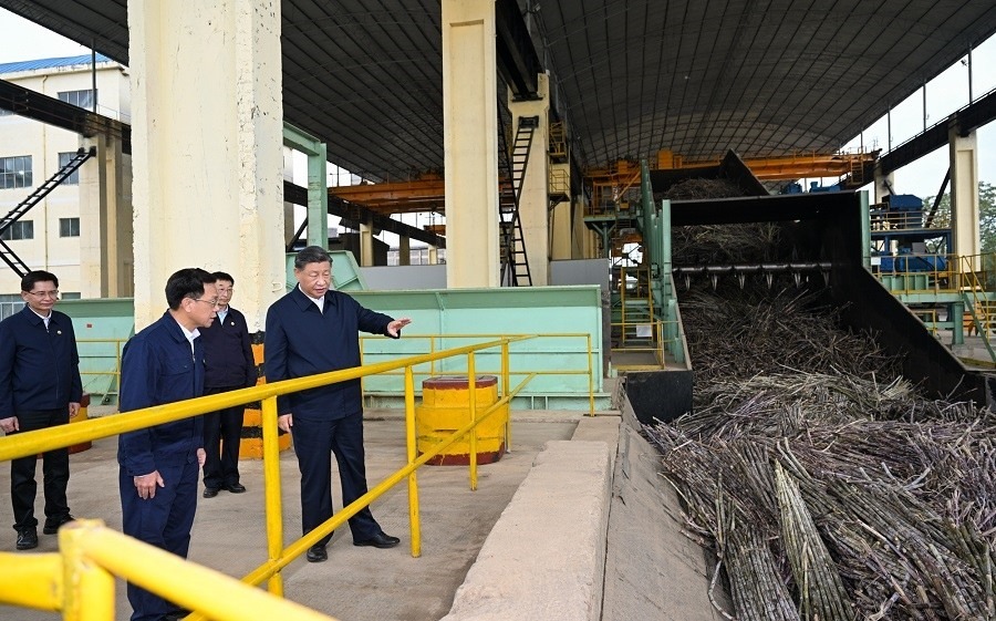 14日下午,習(xí)近平總書記在廣西來賓市考察調(diào)研。他先后來到來賓市國家現(xiàn)代農(nóng)業(yè)產(chǎn)業(yè)園黃安優(yōu)質(zhì)“雙高”糖料蔗基地和東糖鳳凰有限公司,了解甘蔗良種繁育、種植收成、糖產(chǎn)業(yè)發(fā)展等情況。(人民日報記者 徐雋)