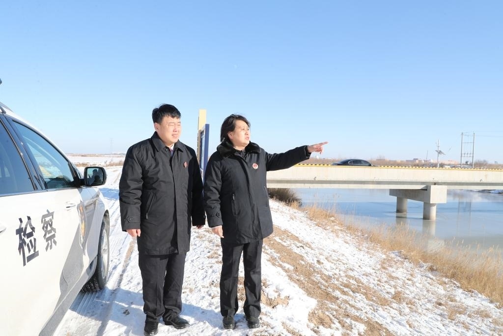 12月一場暴雪后,東營區(qū)檢察院檢察官再次來到武家大溝堤壩檢查河道安全。(劉智峰 攝)