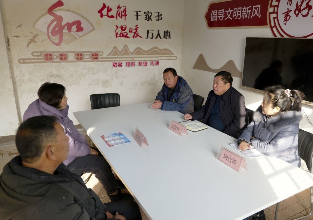 在寶豐縣鬧店鎮(zhèn)范營村“擺理堂”,村鎮(zhèn)干部(右)為村民進行信訪調解(2023年12月20日攝)。河南省寶豐縣積極推進四下基層工作深入開展,已打造鬧店鎮(zhèn)范營村“擺理堂”、石橋鎮(zhèn)東大莊村“老娘舅茶室”等系列鄉(xiāng)村社區(qū)服務陣地,協(xié)調鄰里關系,有效化解各類矛盾,同時不斷豐富工作內容,拓展服務功能,助力鄉(xiāng)村振興。新華社記者 李嘉南 攝