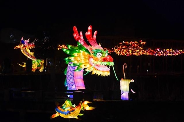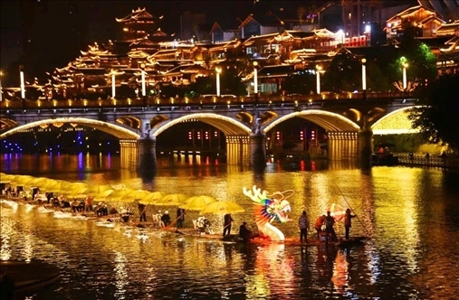 同樣迎來2024年龍年新春燈會(huì)的,還有湖北省恩施州宣恩縣城,這里的龍?jiān)煨蜔艚M格外亮眼,特別是其中一條非常壯觀的“貢水游龍”,龍身由30多只竹筏串聯(lián)而成,總長度達(dá)到200多米。游客還可以登上龍船觀燈展、賞夜色。隨著金色的巨龍?jiān)诒趟序暄延蝿?dòng),也傳遞著吉祥的寓意。