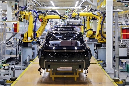 △ 2023年12月10日,江蘇常州一汽車基地的生產(chǎn)車間,機(jī)器臂在組裝新能源汽車。