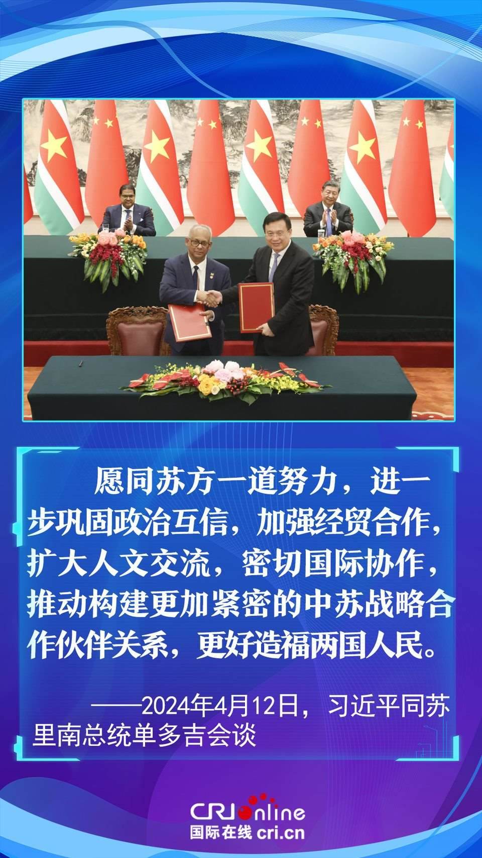今年是中國和蘇里南建立戰(zhàn)略合作伙伴關(guān)系五周年。習(xí)近平主席在會談中以“源遠(yuǎn)流長、歷久彌堅”為中蘇友誼增添了新的注解,為推動構(gòu)建更加緊密的中蘇戰(zhàn)略合作伙伴關(guān)系指明了方向。