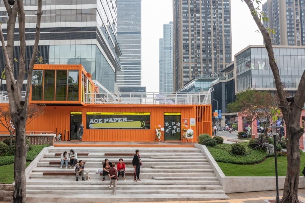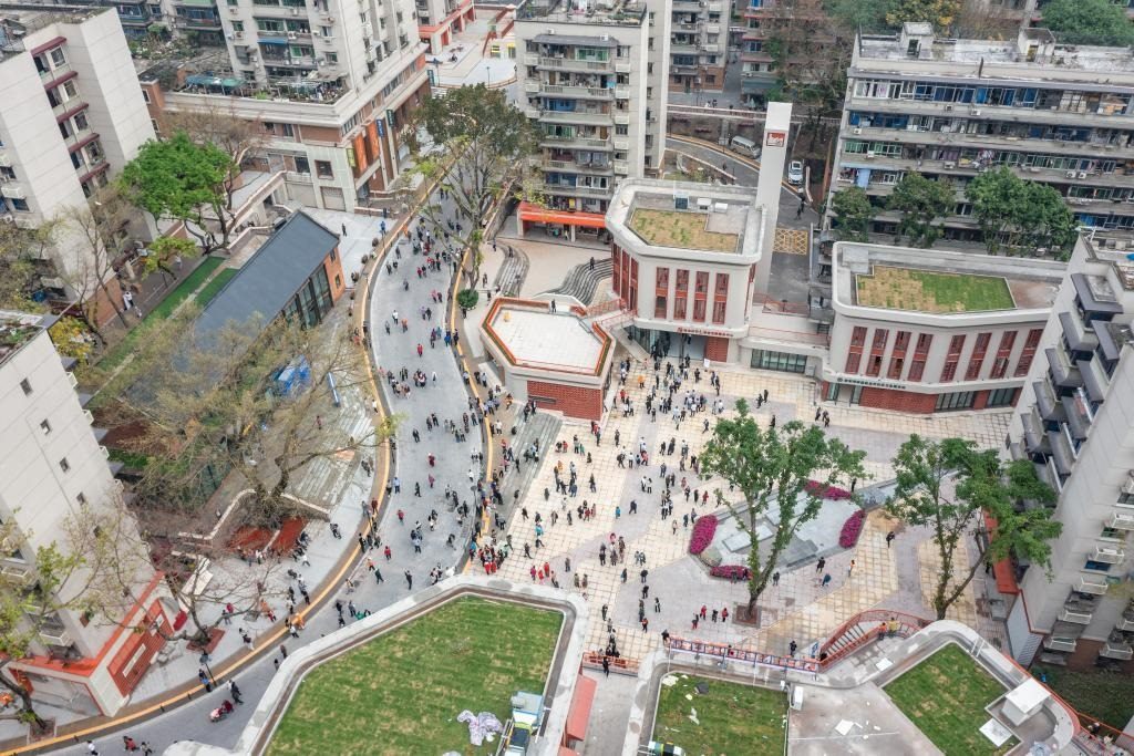 2023年4月28日,在竣工亮相的民主村片區(qū)城市更新項(xiàng)目(一期),人們?cè)谝惶幑部臻g休息(無(wú)人機(jī)照片)。